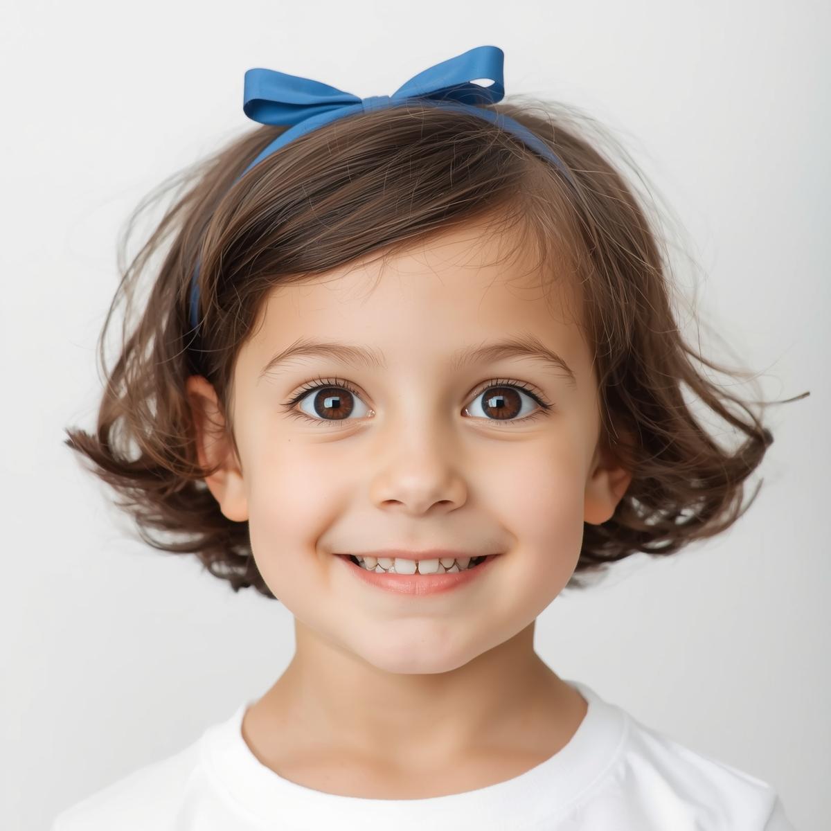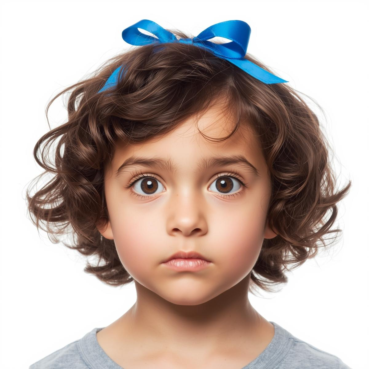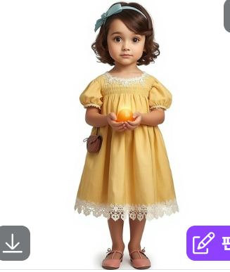 "정면 뷰, 풀 바디샷, 화이트 백그라운드, 둥근 얼굴에 커다란 갈색 눈을 가진 10살 소녀, 파란색 리본 머리띠를 한 짧고 곱슬거리는 갈색 머리, 흰 레이스 장식이 달린 노란색 원피스를 입음, 작은 두 손에 반짝이는 황금 씨앗을 들고 있음, 옆구리에 작은 갈색 주머니를 메고 있음, 분홍색 신발 착용, 순수하고 호기심 가득한 표정."