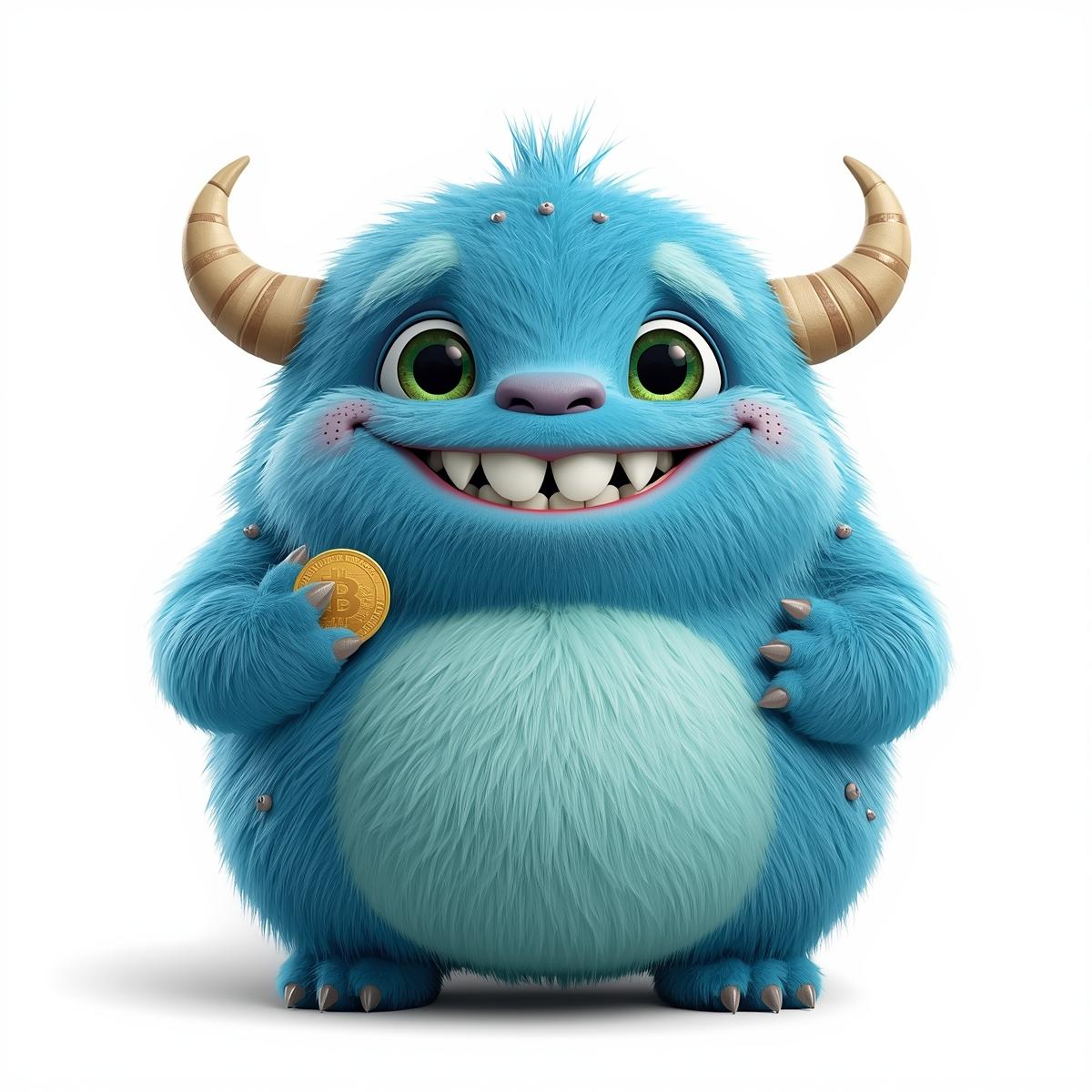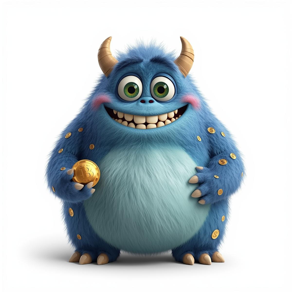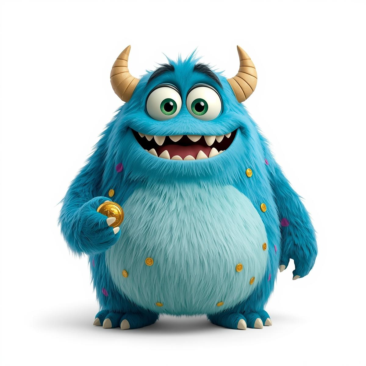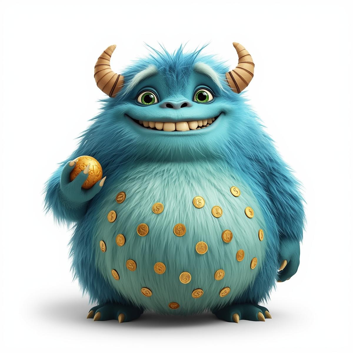 정면 뷰, 풀 바디샷, 화이트 백그라운드, 둥근 파란 털로 덮인 통통한 몸을 가진 귀여운 몬스터, 큰 초록 눈, 작은 베이지색 뿔, 크고 하얀 이가 드러난 넓은 미소, 연한 파란색 배 털, 짧은 팔과 다리, 한 손에는 반짝이는 황금 씨앗을 들고 있음, 털에 작은 동전 모양 무늬가 새겨져 있음, 친근하고 돈을 연상시키는 모습."