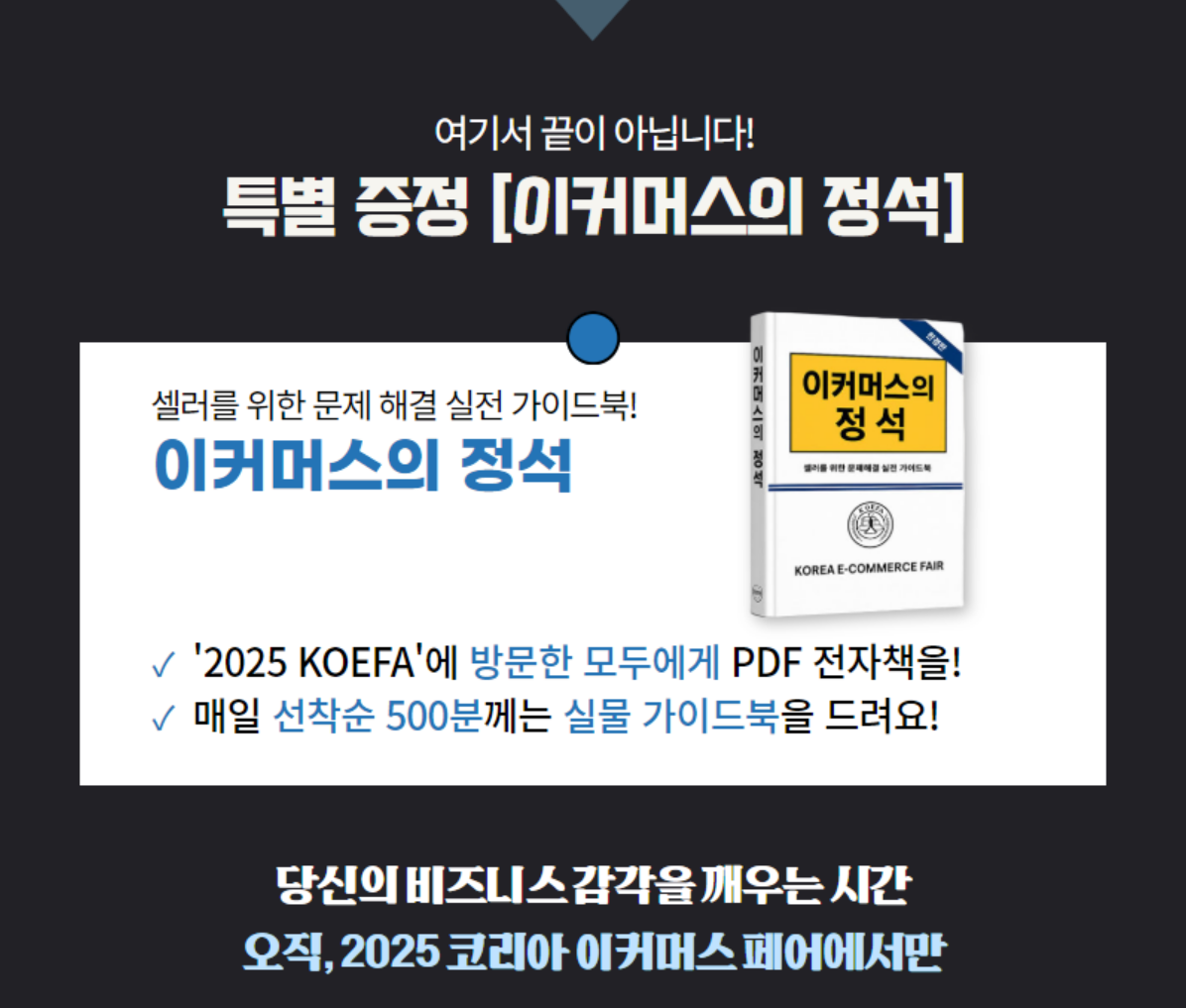 2025 코리아이커머스페어(KOEFA)는 국내 최대 규모의 전자상거래 전문 전시회로, 온라인 쇼핑몰, 커머스 플랫폼, 물류, 마케팅 등 이커머스 산업 전반을 한자리에서 볼 수 있는 행사입니다.